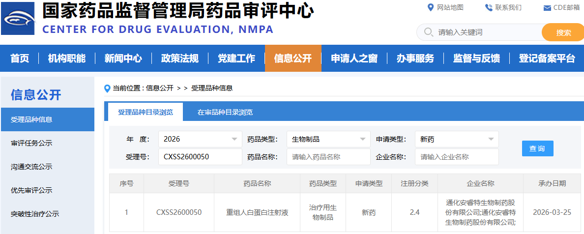 3月25日,国家药监局药品审评中心(CDE)官网显示,通化安睿特生物制药股份有限公司提交的重组人白蛋白注射液(受理号:CXSS2600050) 新药上市申请正式获受理。